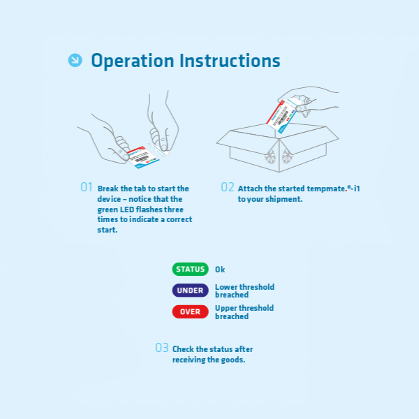 tempmate.®-i1 indicators have been specially developed for monitoring pharmaceutical products’ cold chain. As a pre-programmed device, the tempmate.®-i1 can be immediately deployed for monitoring temperature-sensitive goods and freight. In contrast to chemical indicators, this electronic indicator’s 3 LEDs provide simple, clear feedback on the current condition of your goods.
