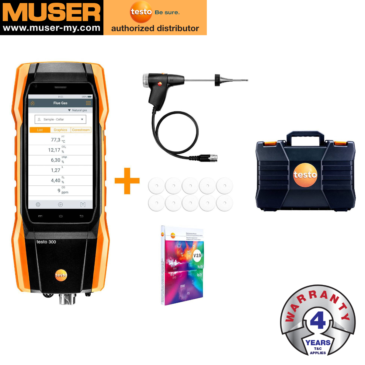 - In the kit: testo 300 Longlife flue gas analyzer, including O2 and CO sensor up to 4,000 ppm, mains unit, basic flue gas probe, spare dirt filters, EasyHeat software, case